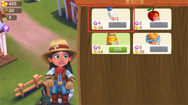 1、查看农场订单需要【牛奶】,当前数量为0/1,需先获取该物品才能完成订单。