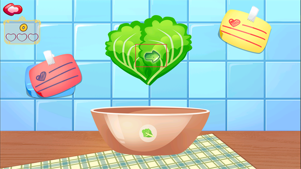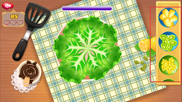 4、添加右侧配料到生菜上,配合工具操作,推进沙拉的制作进度。