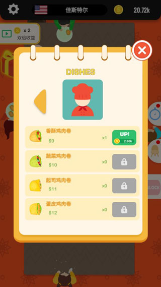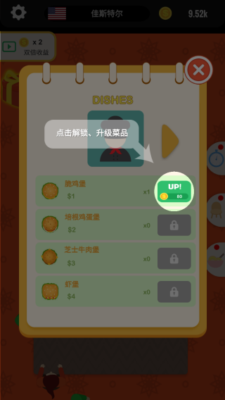2、在【DISHES】界面点击解锁、升级菜品,丰富游戏内容。