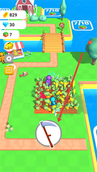 4、农作物成熟后,使用镰刀道具收割,获取农作物资源,积累资源可用于扩大农场规模和解锁新作物。