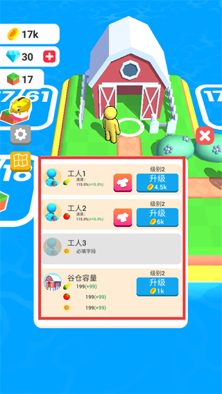 4、升级工人和谷仓容量,如工人1、工人2的等级提升,以及谷仓容量的升级,可提升农场的劳作和存储能力,助力农场规模化发展。