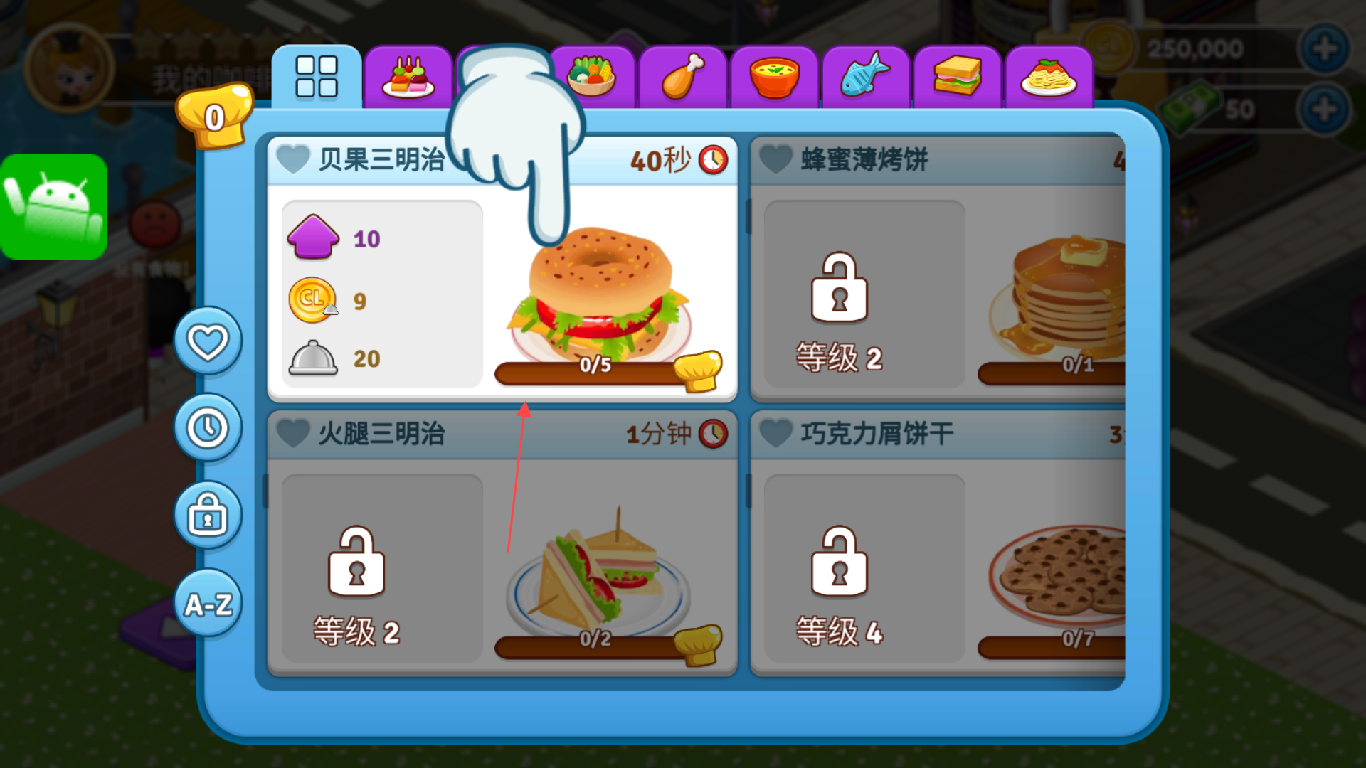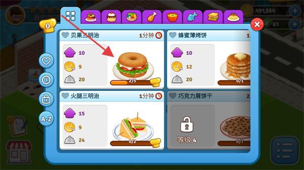 2、之后选择要制作的食物,随着等级的提升,后期会逐渐解锁各种各样的食物。