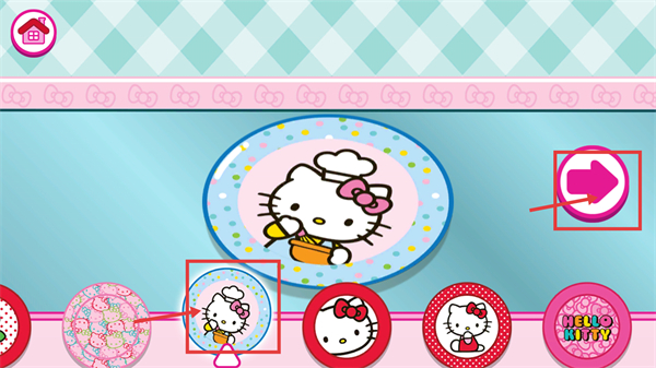 1、界面是HelloKitty厨师主题,点击标注的对应图标,再点右侧箭头按钮,开启本次烹饪关卡的准备流程。