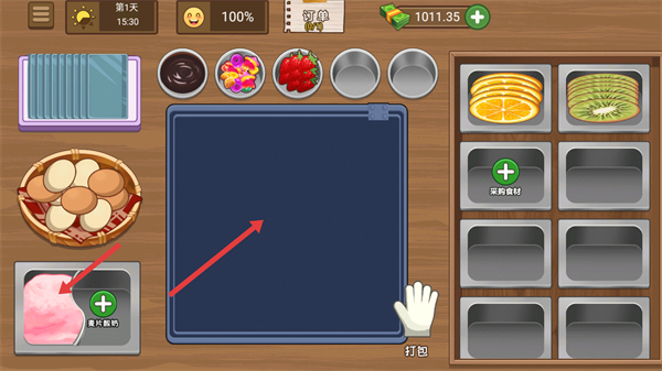 2、制作前点击左下角带【+】标识的【更大容器】按钮拓展空间,再关注右侧【水果食材】区域的可用材料,为操作做准备。