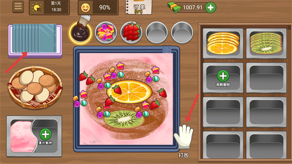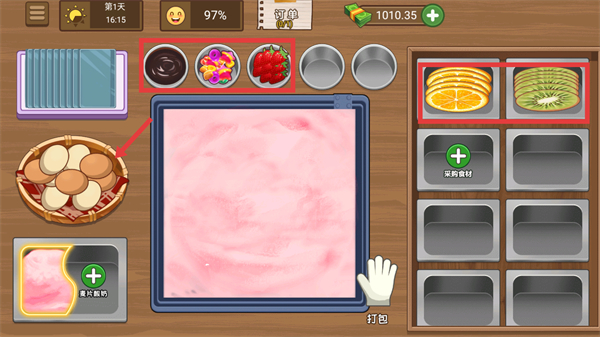 4、完成食材摆放后添加【巧克力酱】装饰,确认搭配无误后,点击右下角【打包】按钮,完成该份炒酸奶的制作。