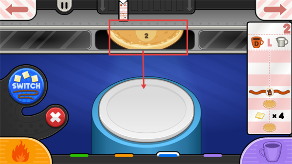 1、看到标有【2】的煎饼时,将其拖拽至下方圆盘处,完成煎饼的转移步骤,同时可借助【SWITCH】按钮切换操作。
