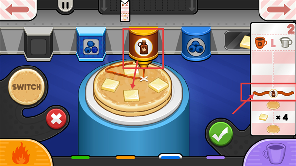 2、按右侧需求,先放置黄油块,再用酱料瓶在煎饼上添加对应酱料,完成配料装饰后点击【√】确认。