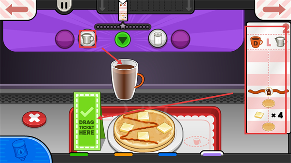 3、制作好饮品后,将【DRAG-TICKET-HERE】对应的票据拖至指定区域,完成餐食与饮品的配餐组合。
