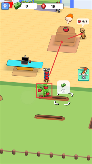 2、找到番茄植株并收集成熟的番茄,满足【番茄-0/1】的收集目标,将番茄运送至指定的棕色装置处完成交付。
