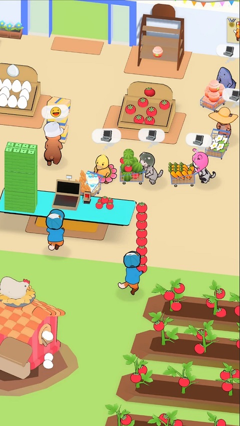 我的动物市场是一款动物主题的迷你休闲经营手游,核心围绕“种植-搬运-销售”全链条市场运营,玩家从亲自打理农田、补充货架起步,通过快节奏服务满足动物顾客的独特需求累积资金,解锁员工、扩建设施与个性装饰,还能通过完成阶段任务解锁专属服饰,在可爱治愈的画风中,体验从小型集市到繁荣市场的成长乐趣,操作简单无门槛,适配碎片化休闲场景。