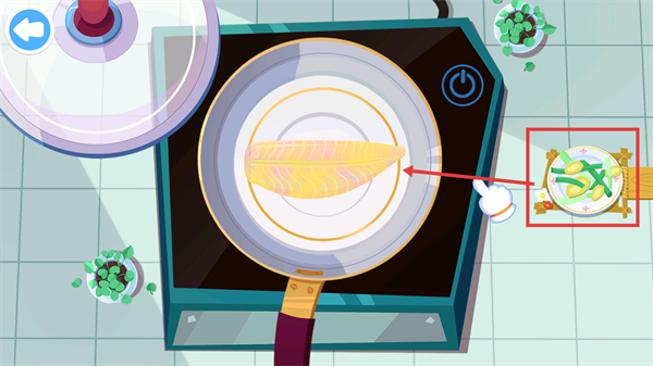 2、按照提示将标注的配菜放到装有鳕鱼的锅中,完成烹饪环节的配料添加步骤,推进该菜品的制作进度。