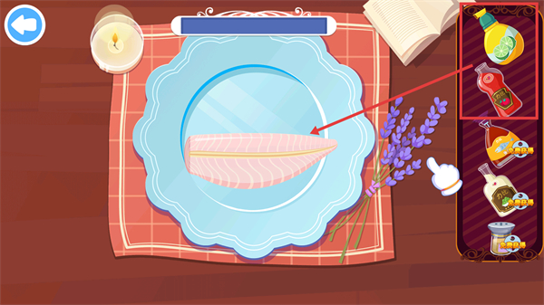 3、在菜品摆盘环节,选择右侧对应的调料添加到鳕鱼上,完成菜品的调味与装饰步骤,完善菜品呈现。
