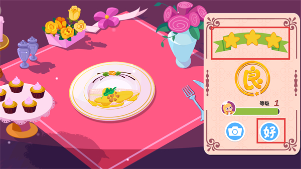 4、完成鳕鱼菜品制作后,获得【3-颗星】评价与【良】评级,当前【等级1】,点击【好】按钮推进至后续烹饪关卡。