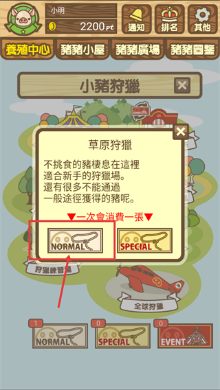 1、进入【小猪狩猎】的【草原狩猎】界面,点击红框内的【NORMAL】选项,消耗对应道具,即可进入该狩猎场景的准备环节。