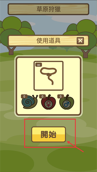 2、在【使用道具】界面,确认道具后点击红框内的【開始】按钮,进入【草原狩猎】的实际狩猎操作环节。