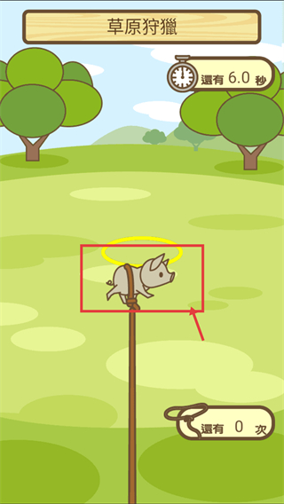3、处于【草原狩猎】倒计时阶段,瞄准红框内的小猪目标进行狩猎操作,注意当前剩余次数为0次的提示。