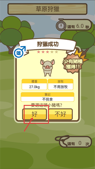 4、狩猎成功后看到【少有豬種獲得!!】的提示,点击红框内的【好】按钮,继续参与下一次小猪狩猎活动。