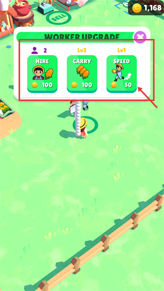2、打开【WORKER-UPGRADE】界面,可选【HIRE】【CARRY】【SPEED】升级项,消耗对应金币提升工人能力,优化农场生产效率。