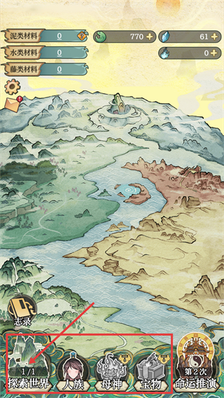 2、点击【探索世界】,开启地图探索,同时关注人族、母神、宝物系统,推动游戏进程。