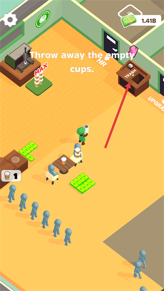 1、根据提示【Throw-away-the-empty-cups】,将空杯子扔到标有【TRASH】的垃圾桶中,保持咖啡店整洁。
