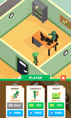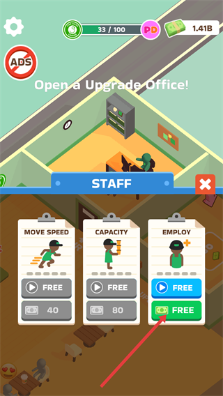3、在升级办公室界面的【STAFF】板块,点击雇佣选项的免费按钮,完成员工雇佣操作,推进游戏进程。