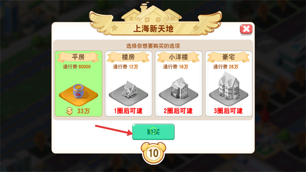 3、遇到可购买地块,选择合适房产类型点击【购买】。