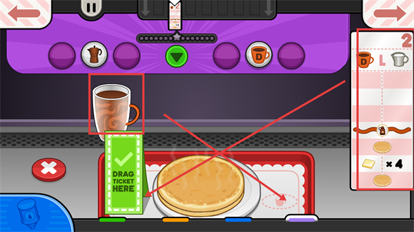 3、按右侧需求准备好餐食与【咖啡杯】后,将【DRAG-TICKET-HERE】对应的票据拖拽至指定区域完成配餐。