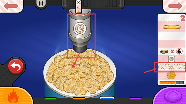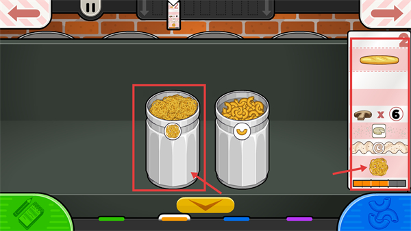 1、查看右侧订单里的【意面】要求,点击被框选的对应意面罐,取出意面以匹配订单中的食材规格。