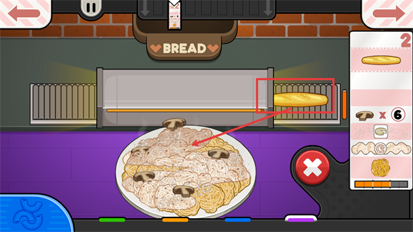 4、完成意面与配料的搭配后,点击被框选的【面包】,将其搭配餐食,满足订单里的配套要求。