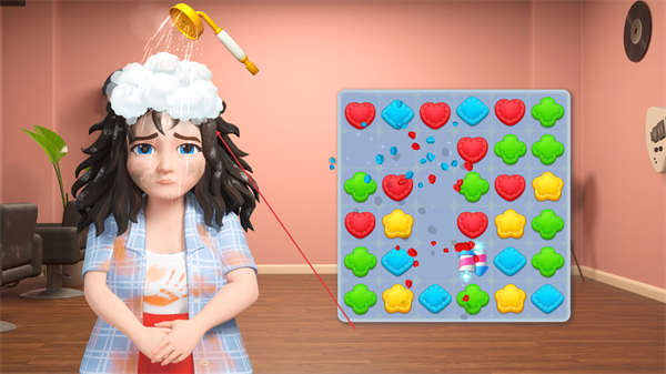 4、道具生效后触发淋浴效果,同时继续消除图案,完成当前关卡阶段目标。