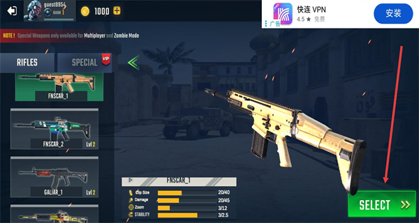 3、在武器选择界面,选中“FNSCAR_1”,点击右下角SELECT按钮,确认武器配置并进入战斗。