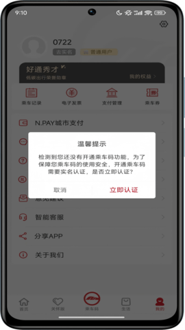 2、然后完成登录和实名认证操作,返回后重新点击“乘车码”功能。