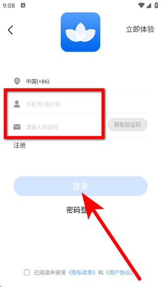 4、在验证码登录界面,输入手机号和验证码,点击登录,完成账号登录。