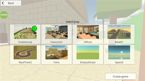 2、进入地图选择界面后,可挑选ChaloHouse、RaceTrack3等不同场景地图,选定目标地图后点击Create-game按钮,即可创建对局并进入对应射击战场。