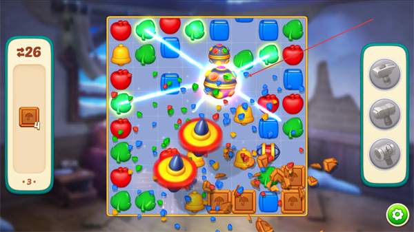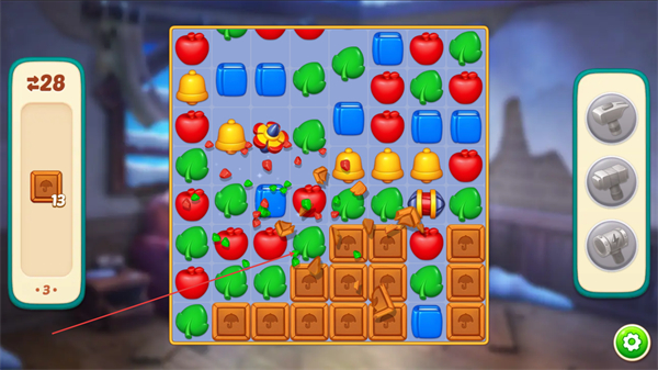 1、优先消除木板图案,积累左侧进度条,同时利用特效道具如爆炸类扩大消除范围。