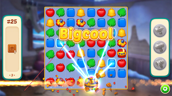 2、触发特效组合如多特效联动,批量清理区域内的图案,快速提升进度条数值。