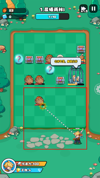 1、点击开始游戏核心玩法是通过弹射操作控制角色攻击敌方单位,收集道具推进关卡进度。
