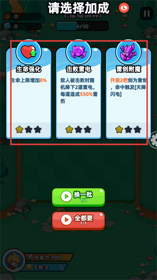 4、通关后进入加成选择界面,可挑选生命强化等增益,按需选择提升角色生存,也可消耗资源“换一批”。