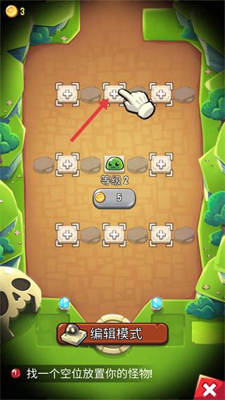 1、在【关卡2】界面,点击右下角的【按钮】进入编辑模式,准备放置新获得的怪物以强化防御。