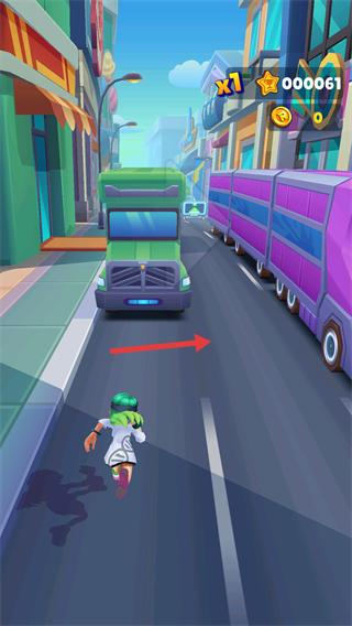 3、遇到【绿色货车】障碍时,操控角色向右侧移动躲避,此时积分累积至【000061】,继续跑酷。
