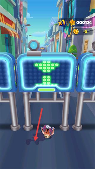 4、面对【蓝色挡板】障碍,操控角色向下滑动躲避,成功通过后积分更新为【000124】,持续推进。