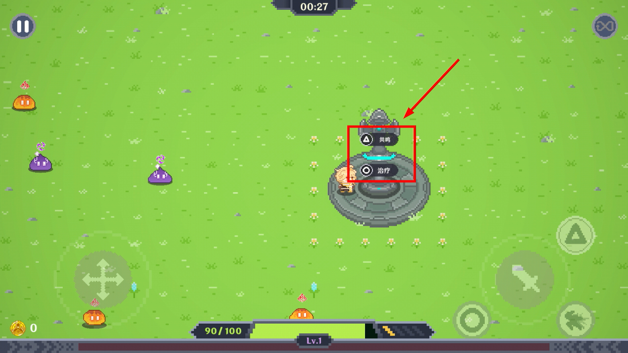 3、进入游戏场景后找到神像,可选择【共鸣】更改攻击属性或【治疗】恢复血量,助力应对后续怪物挑战。