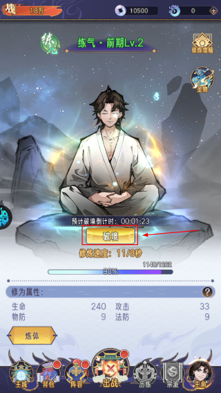 2、在修炼界面点击【破境】,提升至【练气·前期Lv.2】,同时借助修炼速度加成,快速积累修为资源。