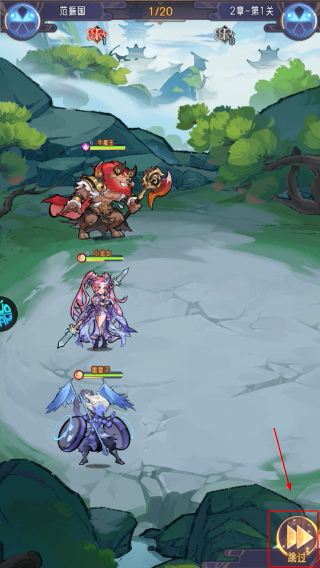 3、在战斗场景中,点击【跳过】快速完成战斗,推进主线关卡进度。