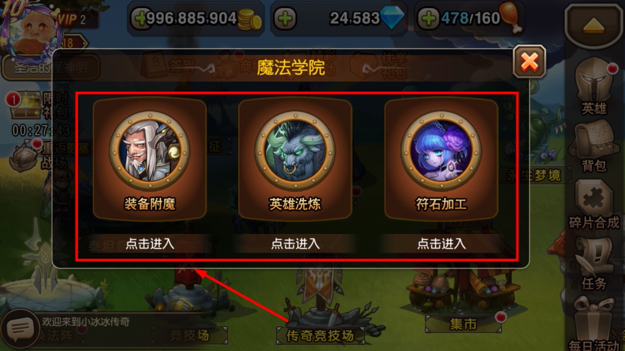 1、在【魔法学院】找到【装备附魔】入口,点击进入可开启装备属性强化操作,为提升英雄战力做前期准备。