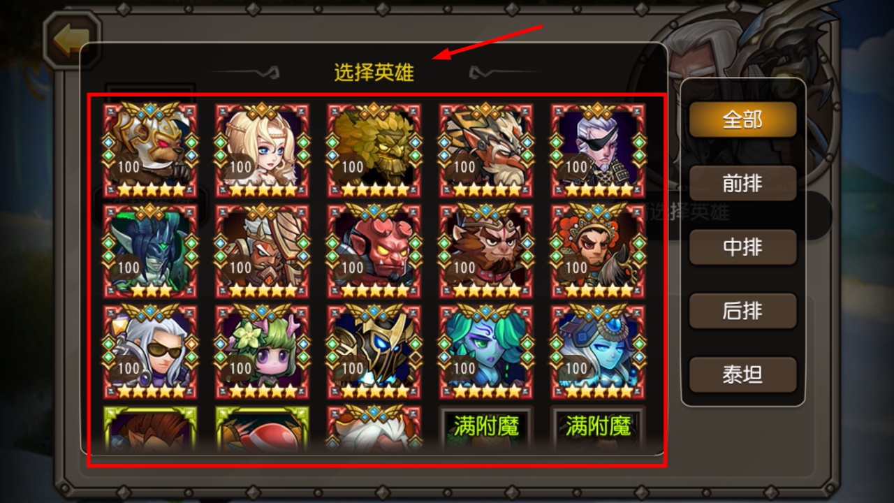 2、进入英雄选择界面,可从五星满级英雄中选目标,也能按前排中排等位置筛选,快速定位需操作的英雄。