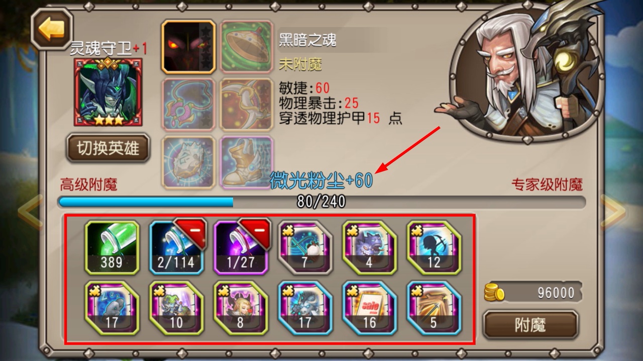 4、添加装备材料后会获得【微光粉尘】,积累足够粉尘能提升附魔等级,增强装备的附加属性。