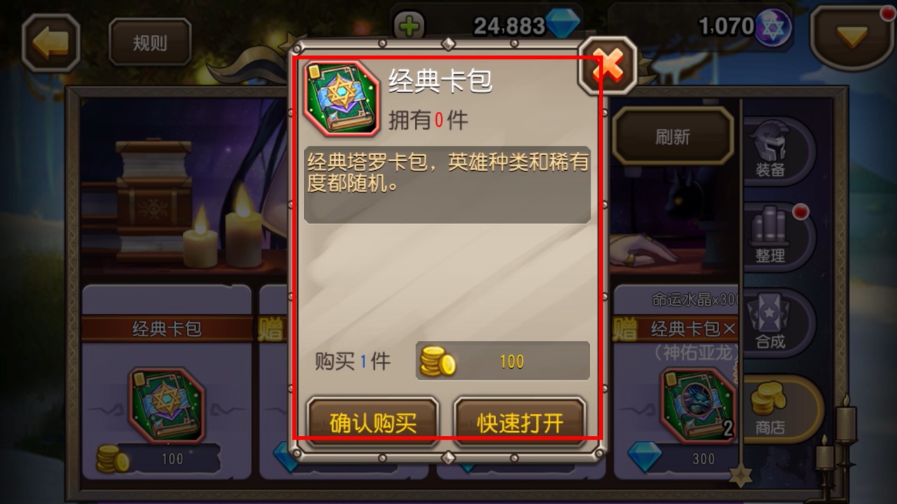 2、消耗100金币购买【经典卡包】,点击【快速打开】可随机获得不同稀有度的英雄,助力阵容养成。