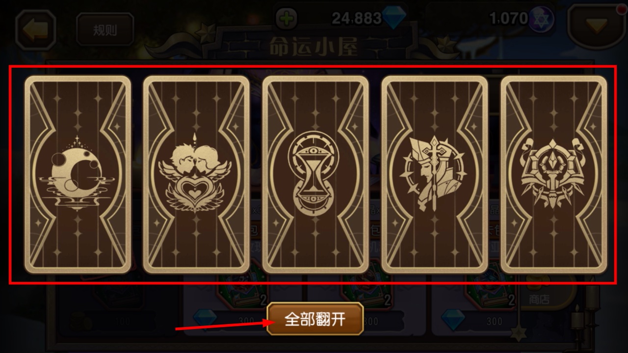 3、在卡牌界面选择【全部翻开】,可一次性查看所有塔罗牌奖励,快速获取心仪的英雄或道具。
