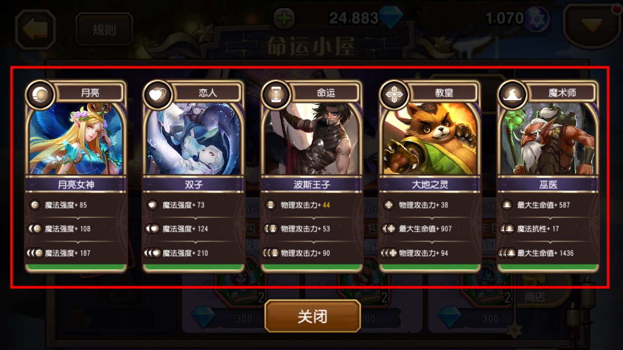 4、翻开卡牌后会获得【月亮女神】【双子】等英雄,每个英雄有独特属性加成,可根据需求选择培养。